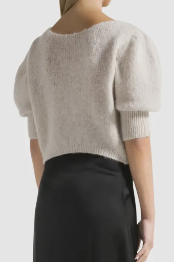 Americandreamsin kaunis lyhyt neuletakki lyhyillä puhvihihoilla. Pehmoinen alpakka tuntuu kivalta iholla. Voit pukea neuletakin myös puseroksi napit selkäpuolelle.