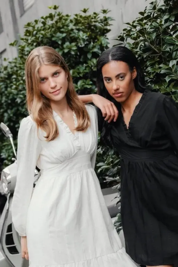 Naisellisessa Umi mekossa on v-kaula-aukko. Voit halutessasi pukea topin alle. Kauluksen pieni frilla ja hyvä istuvuus tekevät tästä monelle vartalolle sopivan. Vyötäröllä mukava kuminauharypytys. Pitkät hihat. Mukana alusmekko.