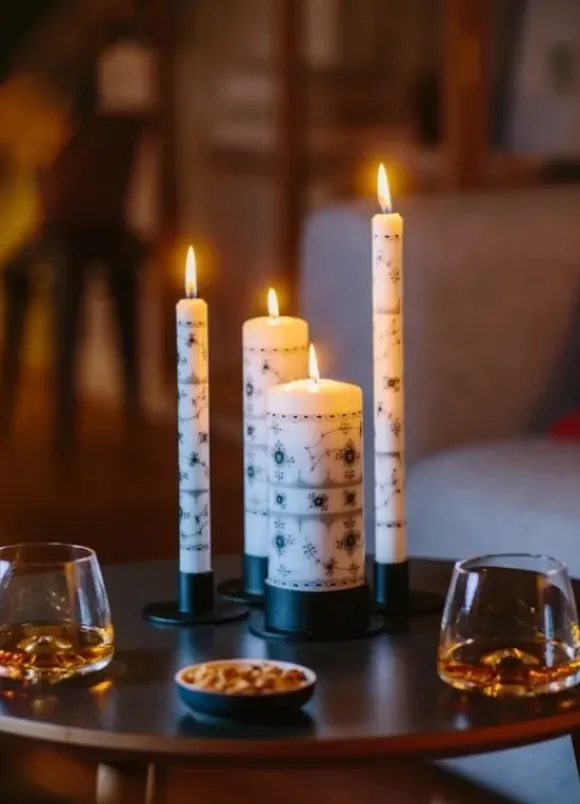 Kaunis klassinen kuviokynttilä, jossa porsliinista lainattu kuviointi. Tämä kynttilä on ensimmäinen kuviokynttilä, joka on saanut ympäristömerkinnän. Kuvio on tehty vesipohjaisilla väreillä.