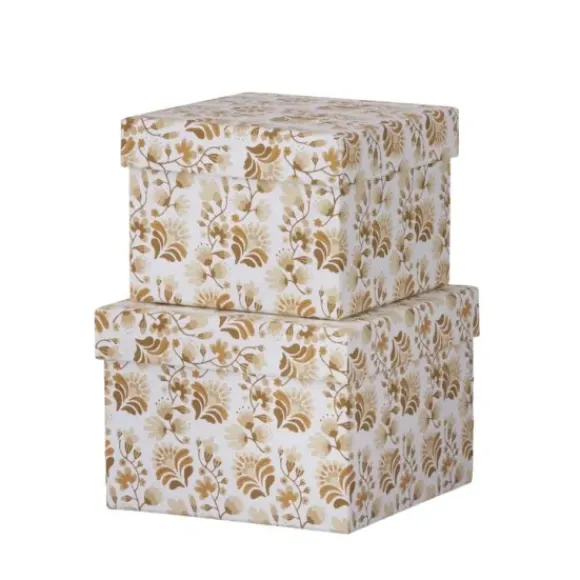Bungalowin kauniit laatikot, joiden päällyspaperi on valmistettu puuvillateollisuuden ylijäämäkuidusta. Nämä säilytyslaatikot on kiva jättää esille. Voit myös käyttää uudelleenkäytettävänä lahjalaatikkona.