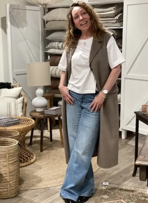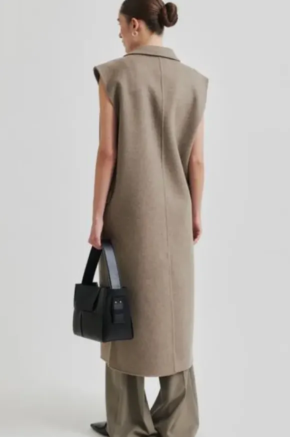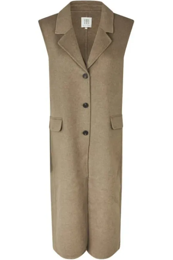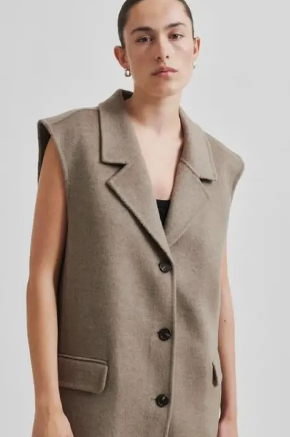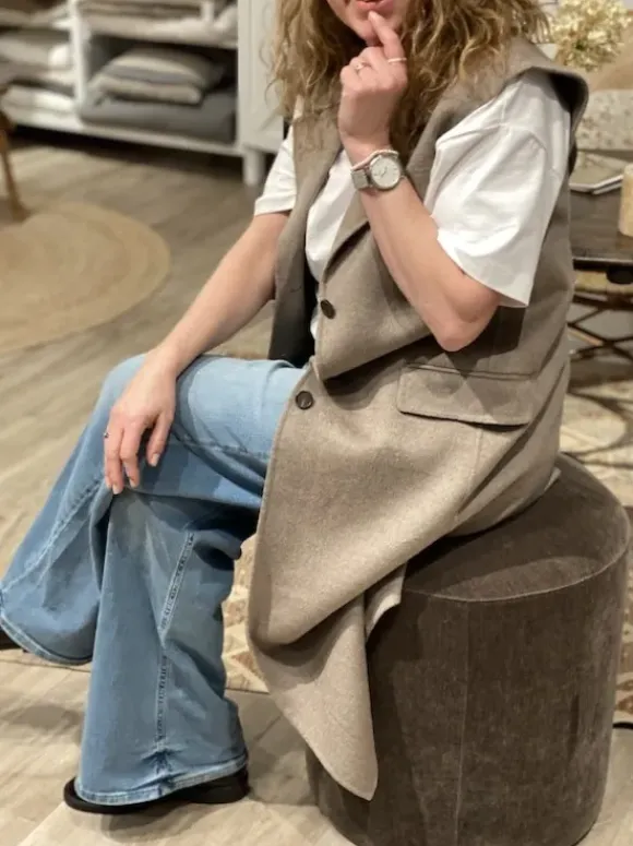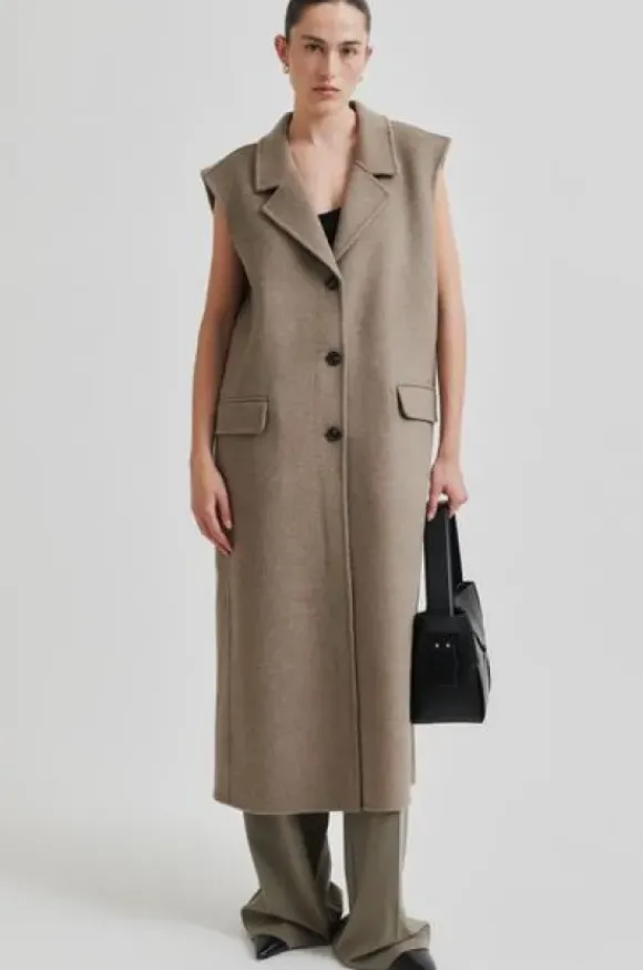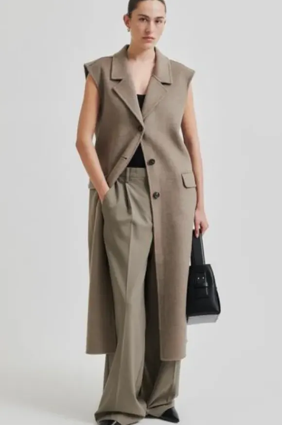 Second Femalen kevätkauden ihana uutuus: pitkä vuoriton villakangasliivi kauniissa meleeratun beigessä sävyssä. Takana halkio.