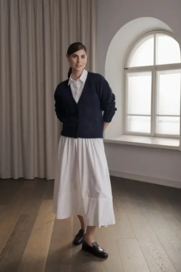 Kellomainen puuvillahame, jossa leveä käänne hameen helmassa. Vyötärönauhassa on kauniit laskostukset edessä ja takana. Vyötäronauhassa on kuminauha takana. Hame on valmistettu orgaanisesta puuvillasta, jossa on elastaania mukana lisäämässä käyttömukavuutta. Kankaan pinta on viimeistelty mattapintaiseksi.