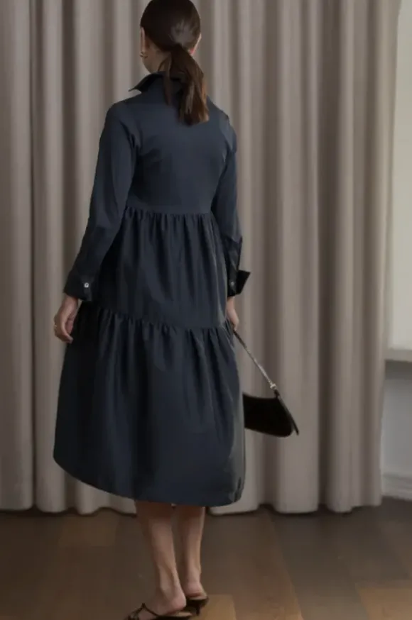 Pitkähihainen mekko on valmistettu laadukkaasta puuvillasekoitteesta. Tyköistuva yläosa, leveät hihansuut ja kaksiosainen, takaa pidemmäksi laskeutuva helma.