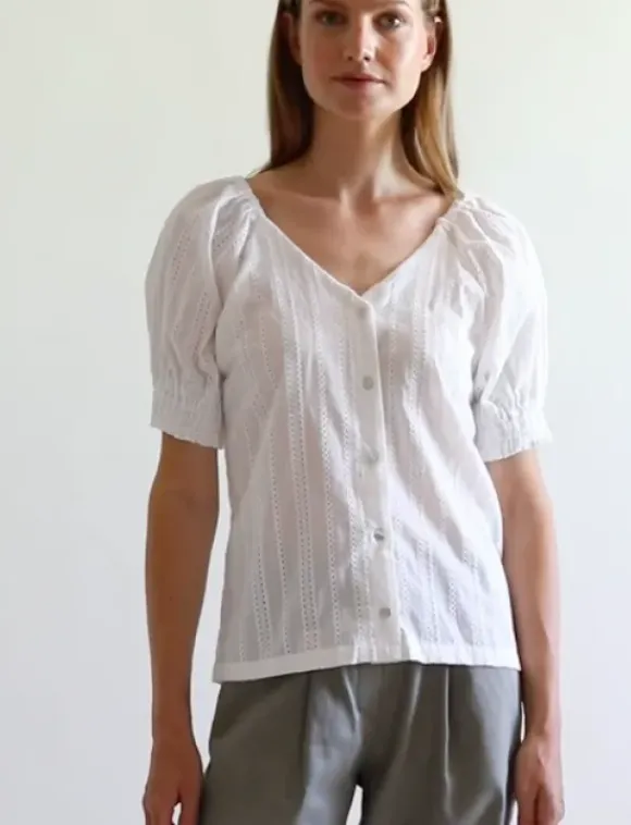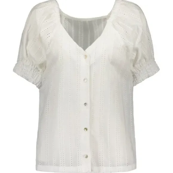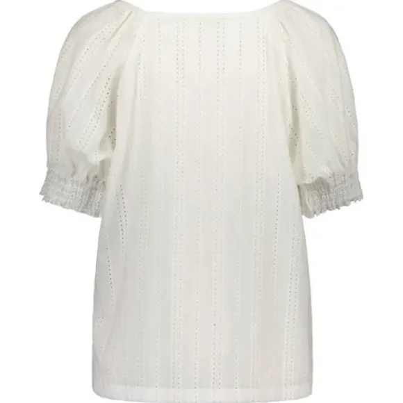 Gauharin kevään uutuus: kaunis puuvillapusero, jossa v-kaula-aukko ja kevyesti puhvitetut hihat. Pusero on valmistettu raikkaasta puuvilla-popliinista, jossa kaunis broderie anglaise reikäkuviointi.