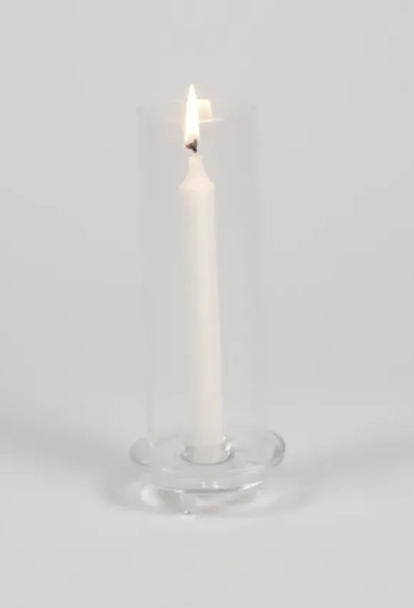Ajaton lasinen kynttilänjalka kruunukynttilälle. Kynttilän suojana sylinterin mallinen nostettava kupu. Kaunis yksinään tai ryhmänä…