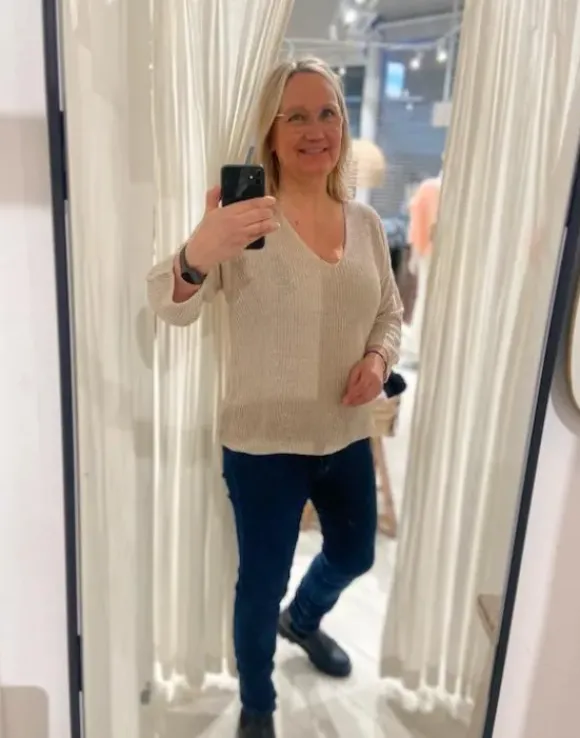 Maaritilla toppi kokoa XL Part Twon Etrona pellavaneuleen alla!