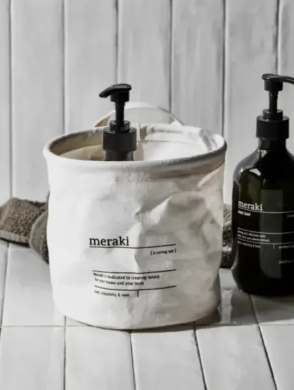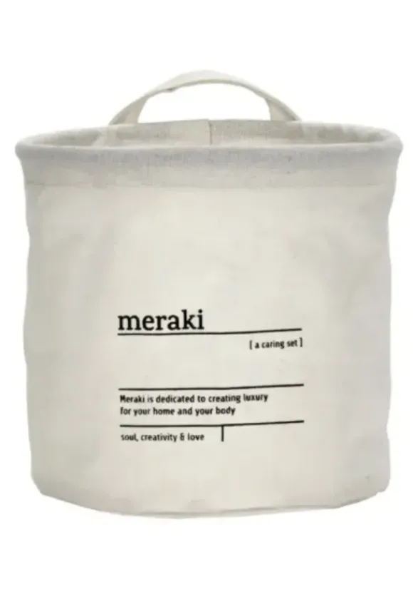 Tanskalaisen Merakin kankainen säilytyskori kylpyhuoneeseen, vessaan tai vaikkapa vaatehuoneeseen. Korissa toisella reunalla ripustuslenkki. Sivussa Merakin logo teksteillä.