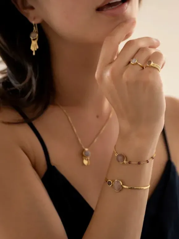 Tässä a Beautiful Storyn kauniissa kullatussa rannekorussa on soikea fasetoitu persikkainen kuukivi ja pyöreä fasetoitu granaattijalokivi.