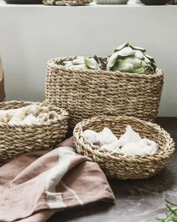 Kauniit korit leiville, valkosipuleille, mausteille ja muuhun keittiön säilytykseen.