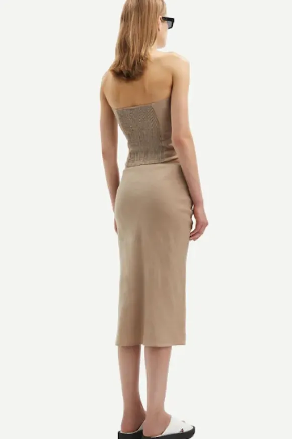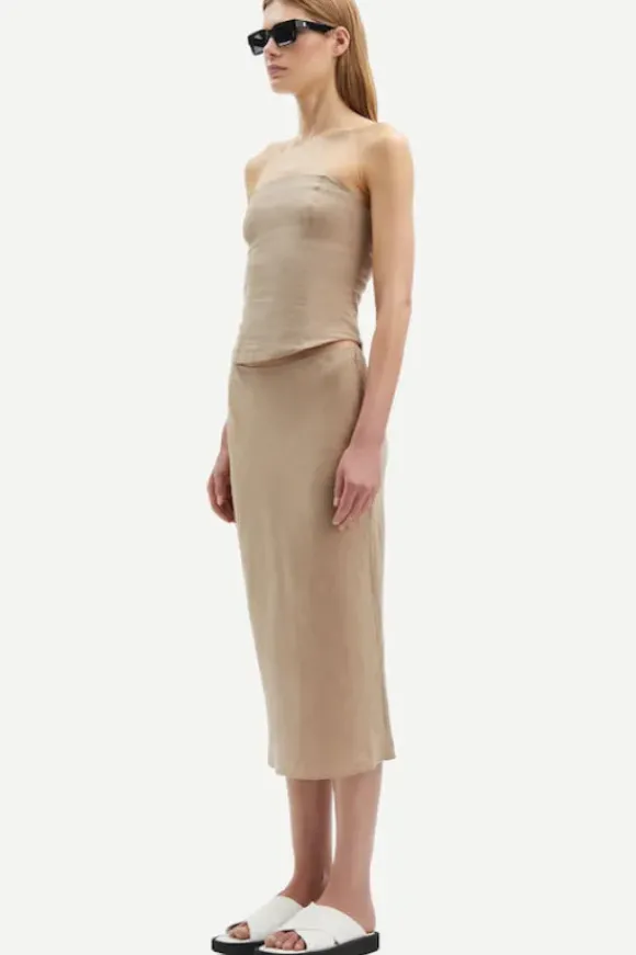 Samsoen kaunis hihaton toppi, jossa takana piilovetoketju ja hakanen. Kuminauha takaosassa helpottava pukemista. Slim fit malli. Kaareva helma. Yhdistä saman sarjan hameen kanssa kesäinen kokonaisuus. Materiaalina pellava.