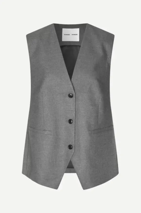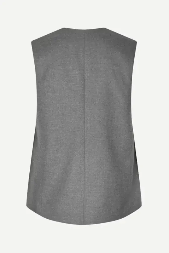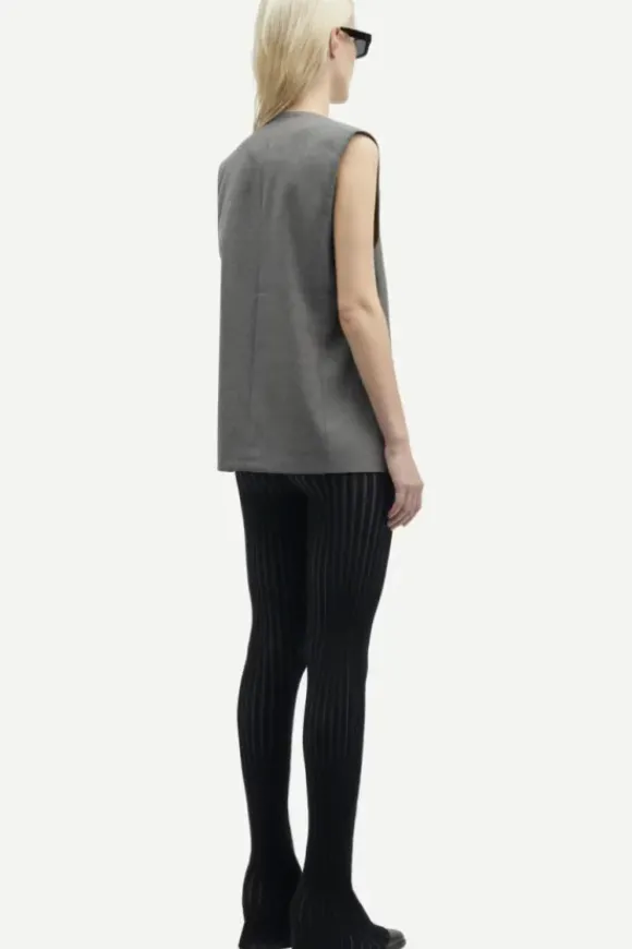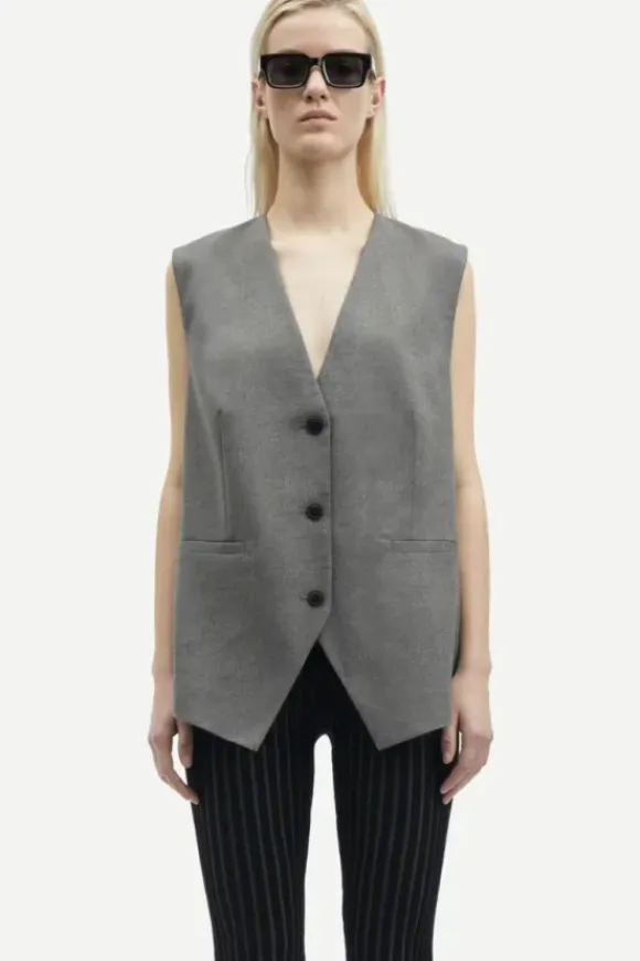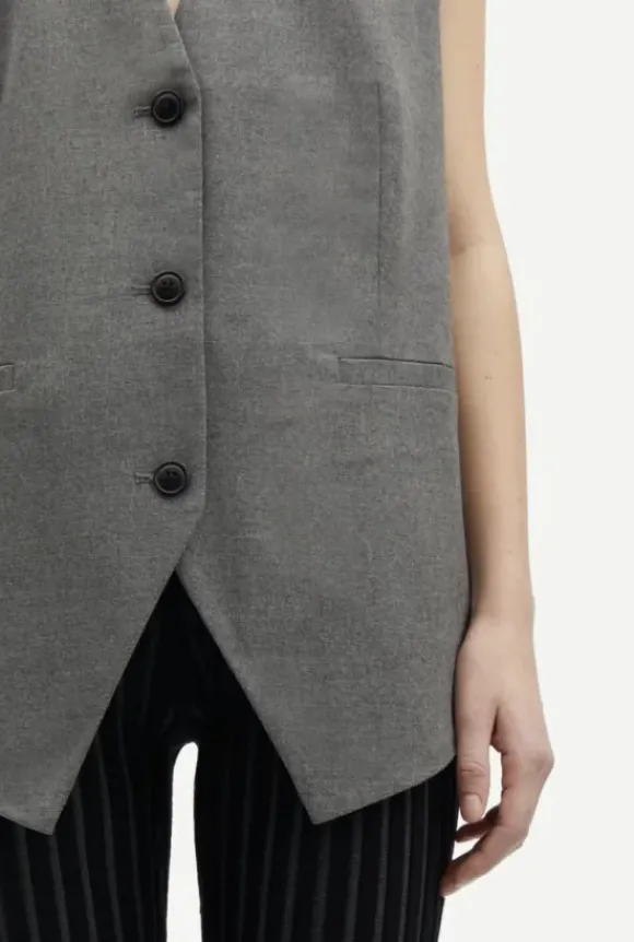 Vest with a loose fit. Single-breasted button closure on the front. Welt pockets on the sides and inside. Fully lined. Main material made from an elastic blend with recycled polyester. This product is GRS certified. Each stage of the supply chain has met strict social, environmental, and chemical requirements.