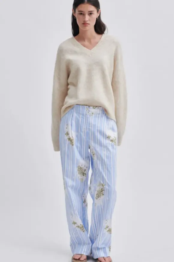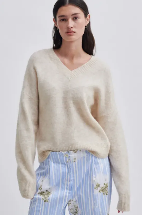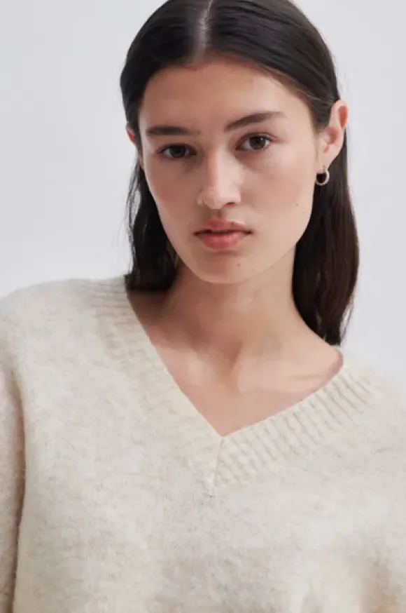 Second Femalen klassinen neulepusero v-kaula-aukolla. Materiaalina ihanan pehmeä mohairin ja villan sekoitus. Yhdistele monipuolisesti farkkujen, suorien housujen tai lempparimekon kanssa. Our darling! <3