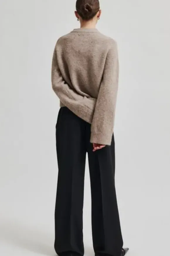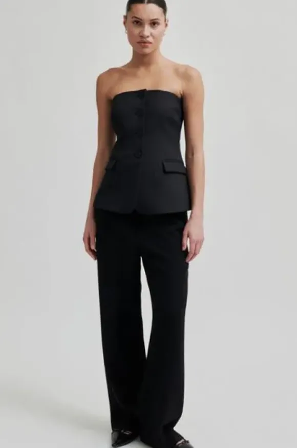 Second Femalen ajattomat suorat housut leveillä lahkeilla. Vyötärössä takana kuminauha. Edessä sivutaskut, takana piilotaskut.