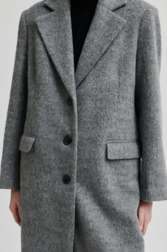 Second Femalen kaunis, klassinen villakangastakki pehmeää villasekoitetta. Kiva, eläväinen meleerattu sävy. Pituus polven alle.