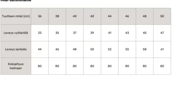 Kapealinjainen satiinihame midi-pituudella tarjoaa tyylikkään ja eleettömän ilmeen. Vyötärönauhan sisäpuolelle piilotettu kuminauha lisää käyttömukavuutta säilyttäen samalla hameen huolitellun ulkonäön.
