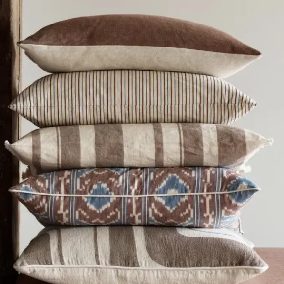 Tine K Homen uutta: kaunis puuvilla-pellava tyyny raidoilla luo ilmettä tilaan kuin tilaan! Päädyissä pienet hapsut tuomassa ilmettä.