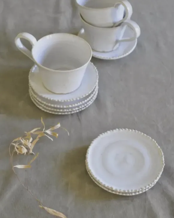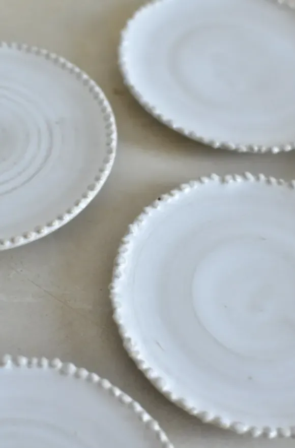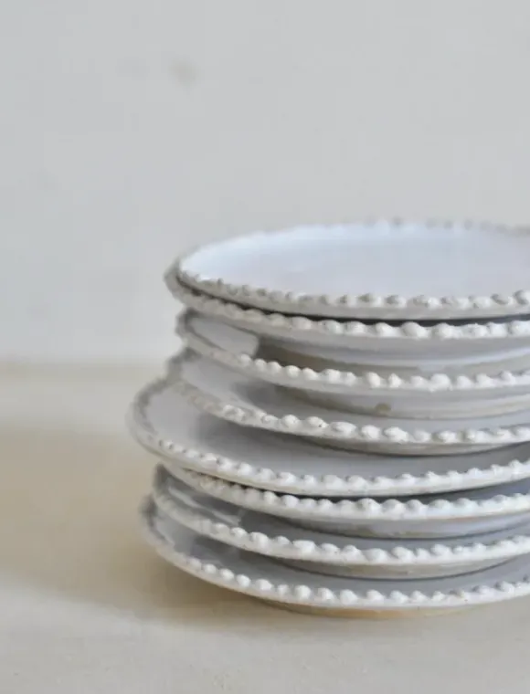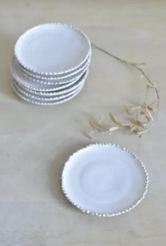 Pearl plate, white series. The diameter of the plate is about 11.5 cm. This small pearl plate fits well for example, under a coffee cup or under a small candle or for tea bags, etc. Small balls surround the edge of the plate, from which the plate got its name, pearl plate. Each product is unique, handmaded. The product is stoneware and is dishwasher safe.
