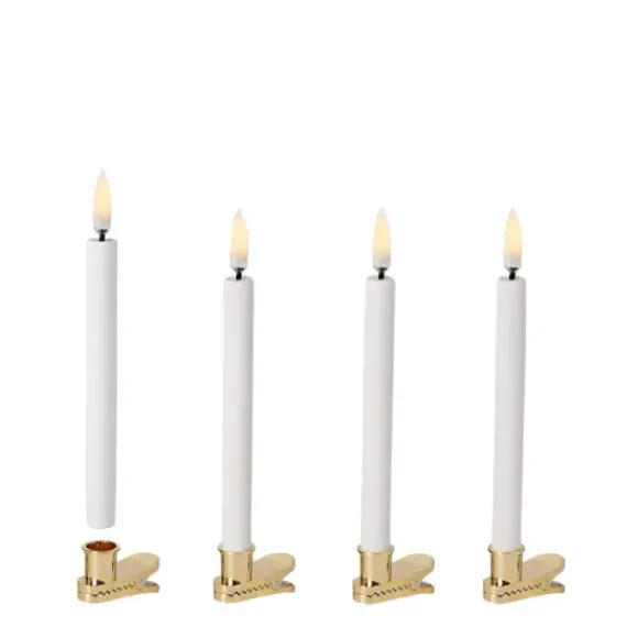 Joulukuusen LED-kynttilät klipsikiinnityksellä. Kaunis kullanvärinen klipsi pysyy hyvin kuusen oksassa. Kynttilän pituus 13,8 cm. Pakkauksessa 4 kynttilää.