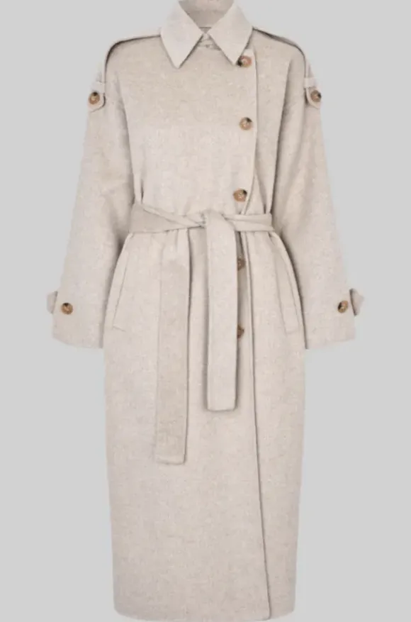 Second Femalen ajaton pitkä villakangastakki, jossa napit hieman sivussa tuomassa ilmettä. Napilliset tampit hihansuissa ja olalla. Pue vyön kanssa tai rennommin ilman vyötä. Kaunis, klassinen malli syksyyn ja talveen! <3