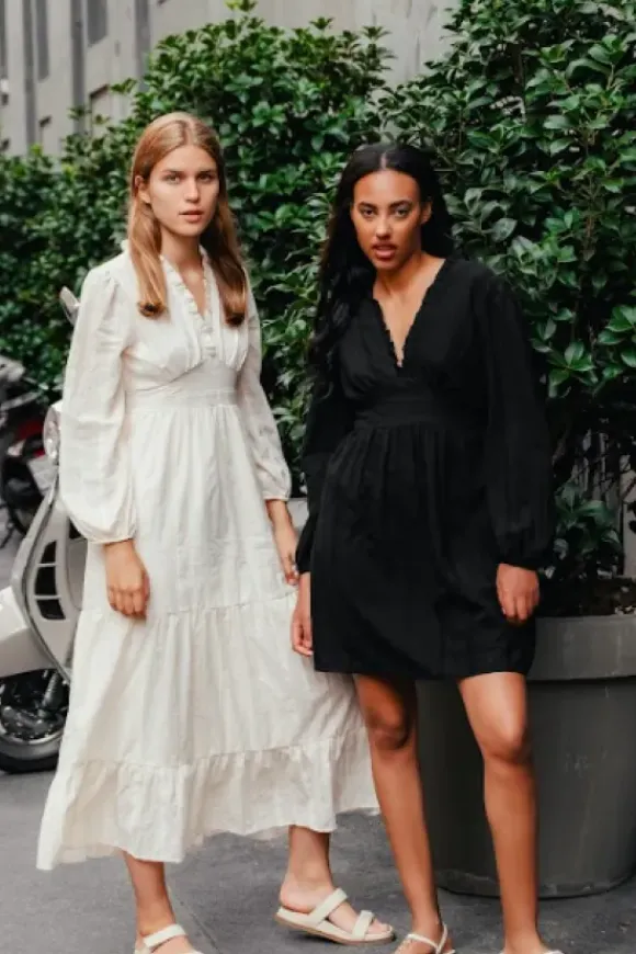 Naisellisessa Umi mekossa on v-kaula-aukko. Voit halutessasi pukea topin alle. Kauluksen pieni frilla ja hyvä istuvuus tekevät tästä monelle vartalolle sopivan. Vyötäröllä mukava kuminauharypytys. Pitkät hihat. Mukana alusmekko.