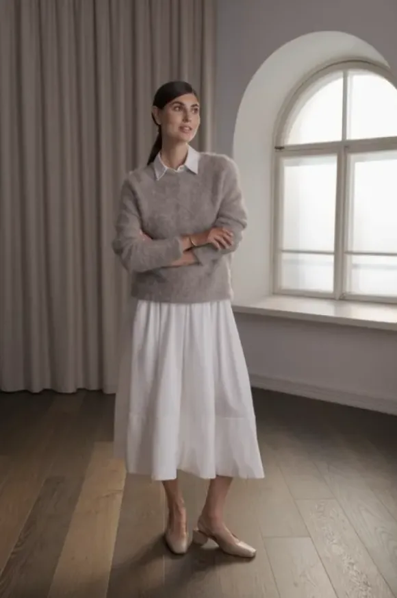 Kellomainen puuvillahame, jossa leveä käänne hameen helmassa. Vyötärönauhassa on kauniit laskostukset edessä ja takana. Vyötäronauhassa on kuminauha takana. Hame on valmistettu orgaanisesta puuvillasta, jossa on elastaania mukana lisäämässä käyttömukavuutta. Kankaan pinta on viimeistelty mattapintaiseksi.