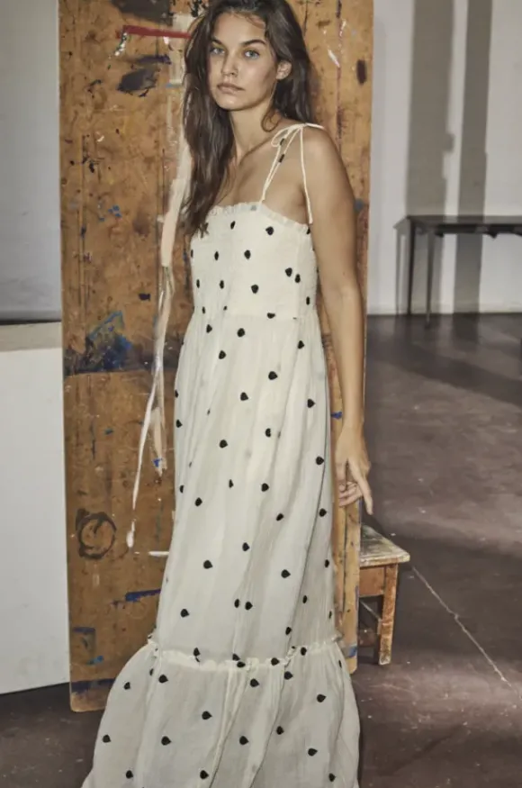 Co’couturen kaunis spagettiolkaiminen mekko lämpimiin kesäpäiviin. Miehustassa mukava kuminauharypytys, helmassa kevyt frilla. Kiva pisarakuosi!
