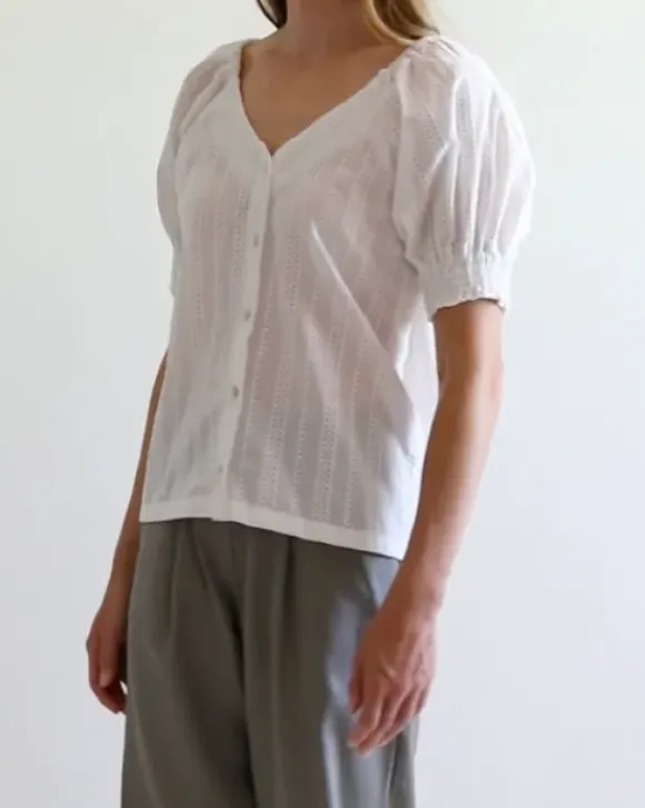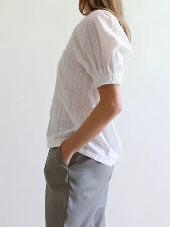 Gauharin kevään uutuus: kaunis puuvillapusero, jossa v-kaula-aukko ja kevyesti puhvitetut hihat. Pusero on valmistettu raikkaasta puuvilla-popliinista, jossa kaunis broderie anglaise reikäkuviointi.