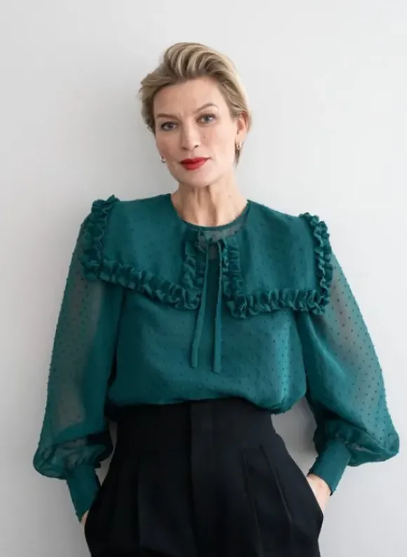 Kotimaisen Gauhar Helsingin neliönmuotoinen kaulus, jossa röyhelöyksityiskohdat, leikkisät pilkut ja rusettikiinnitys.