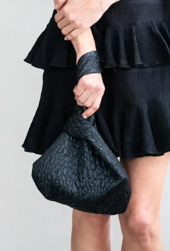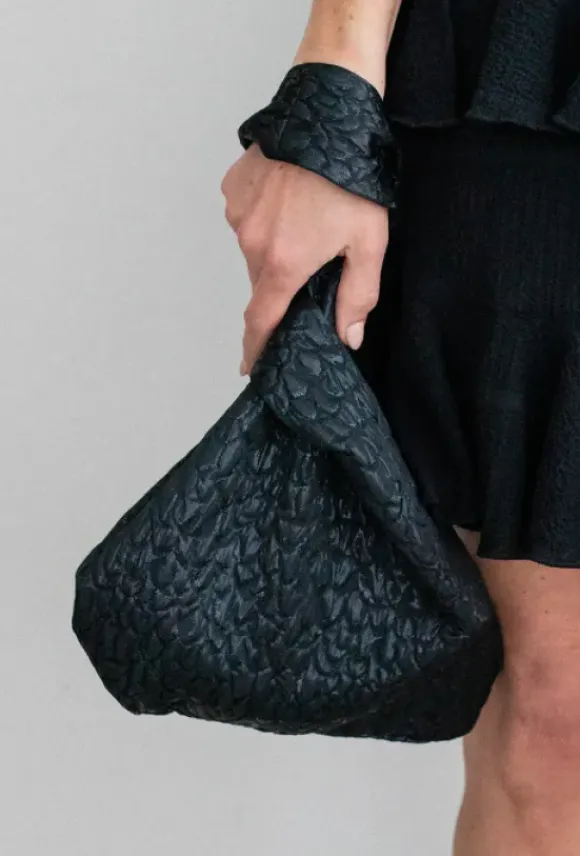 Näppärän kokoinen pieni pussukkamainen käsilaukku iltamenoihin. Tähän pussukkaan mahtuvat huulipuna, avaimet ja kännykkä. Kiva kevyesti kiiltävä kangas. Pussukassa musta vuorikangas.