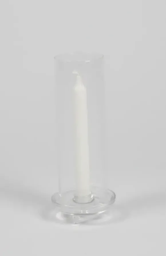 Ajaton lasinen kynttilänjalka kruunukynttilälle. Kynttilän suojana sylinterin mallinen nostettava kupu. Kaunis yksinään tai ryhmänä…