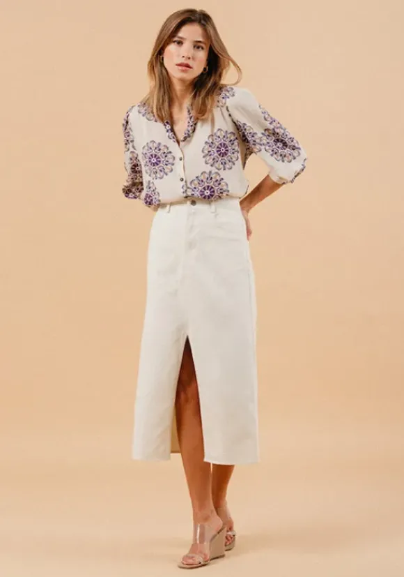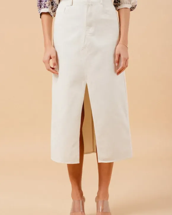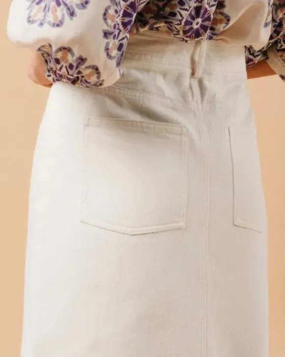 Luonnonvalkoinen pitkä farkkuhame, jossa halkio edessä. Kiva kesähame t-paidan, kukkapaitiksen tai vaikkapa pehmeän neuleen kanssa!