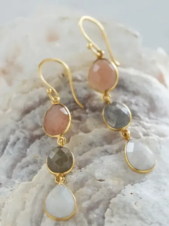 Näissä upeissa 22 karaatin kullatuissa roikkuvissa korvakoruissa on 3 fasetoitua jalokiveä, jotka ovat persikkainen kuukivi, kuukivi ja labradoriitti. Kauniit korvakorut näyttävämpään lookkiin.