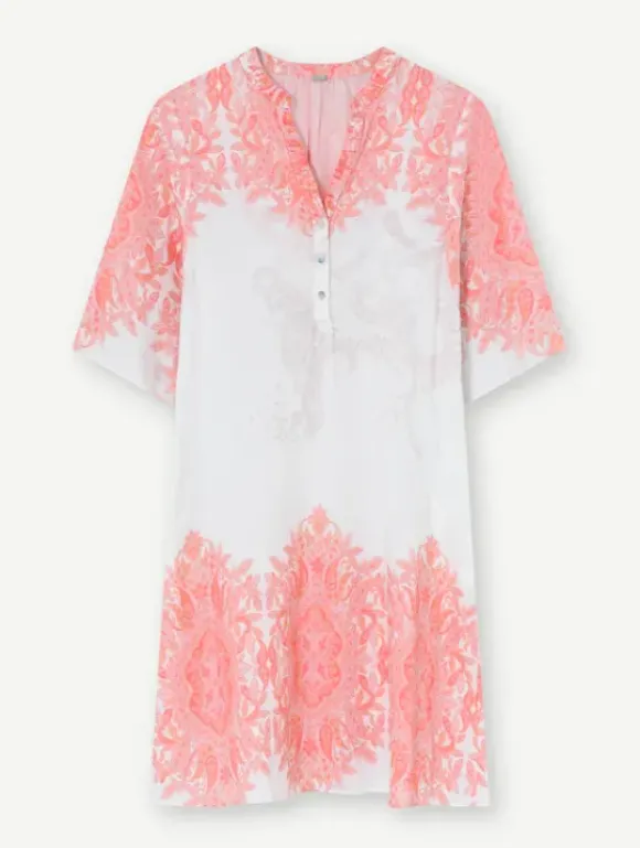 Tässä mekossa valkoisella pohjalla korallin sävyinen kuviointi.