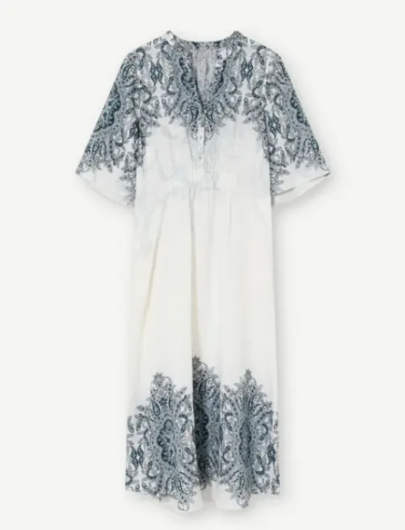 Tässä mekossa valkoisella pohjalla sininen kuviointi. Istuvuutta lisäämässä rypytykset vyötäröllä edessä ja takana.