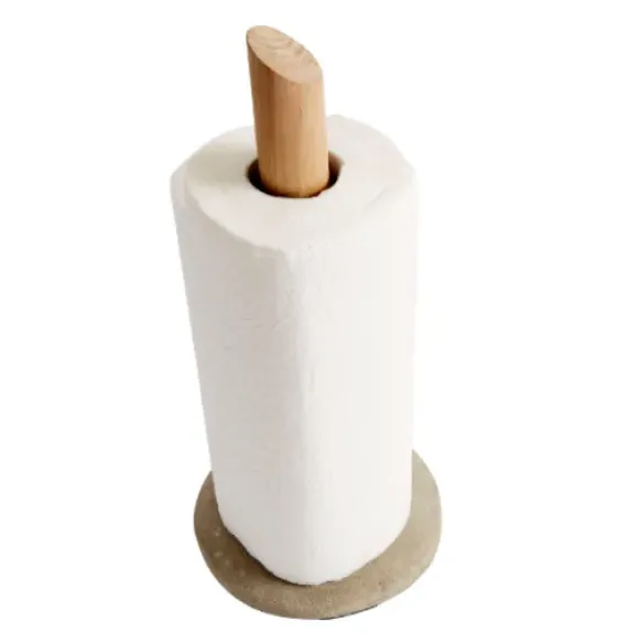Tanskalaisen Muubsin kaunis teline talouspaperille. Materiaaleina tiikki ja hiekkakivi. Hiekkakivi tekee telineestä tukevan ja hyvin paikallaan pysyvän.