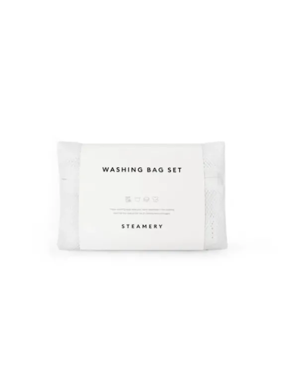 Konepyykille tarkoitetut vetoketjulla suljettavat Steamery Stockholmin pesupussit, joiden tarkoitus on suojata vaatteita pesun aikana.