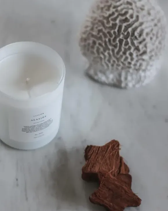 Laadukkaasta vahasta Suomessa valmistettu Vegaaninen Seaside -tuoksukynttilä palaa puhtaasti ja tasaisesti.