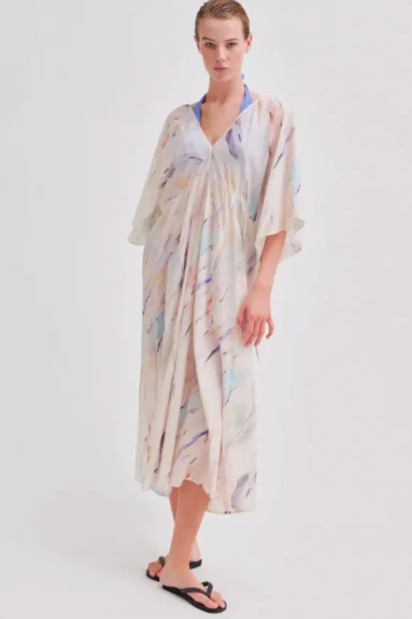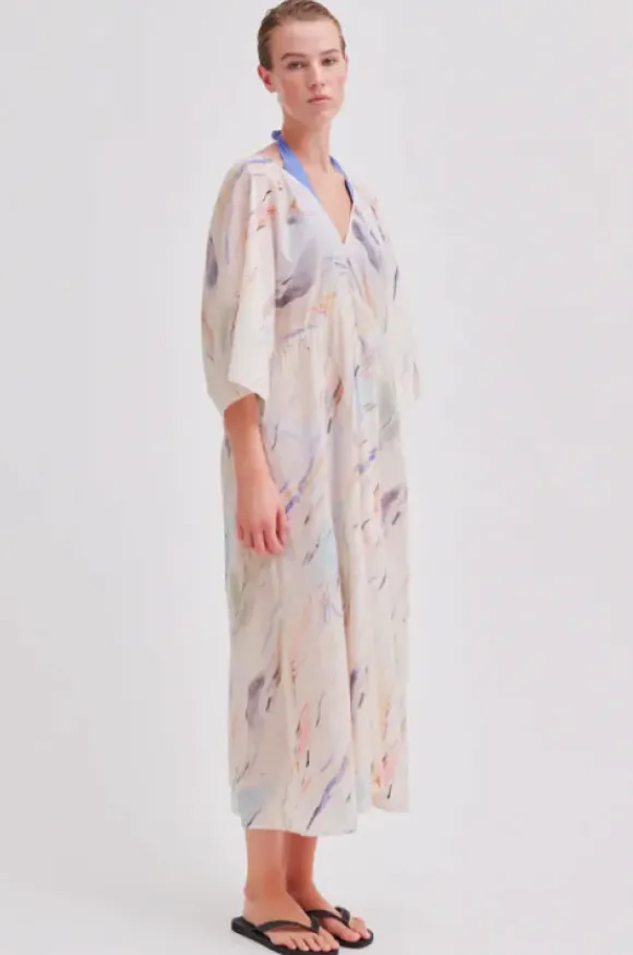 Second Femalen superkaunis pidempi mekko kesään. Mekossa v-kaula-aukko ja niskassa solmimisnaru. Herkkä kuvionti muistuttaa kaunista taideteosta.