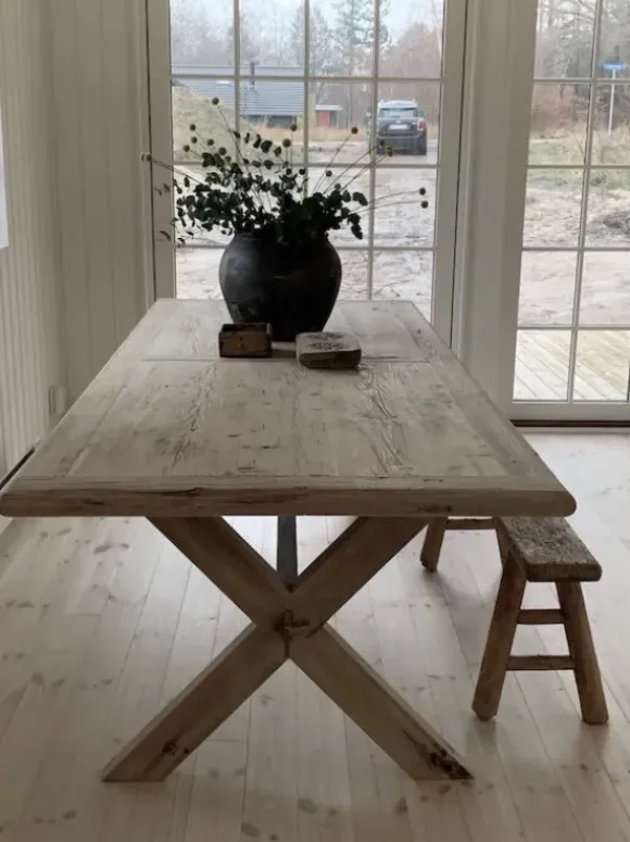 Snowdrops Copenhagenin ihastuttava natural sävyinen ruokapöytä luo kotiisi pehmeän, luonnollisen tunnelman. Kansiosa on vanha ovi ja se on tehty jalavasta. X-mallinen runko on mäntyä ja se on tehty sopivaksi skandinaaviseen tyyliin. Sopivan rouhea yksilö. Our darling!