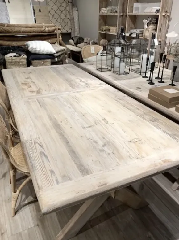 Snowdrops Copenhagenin ihastuttava natural-sävyinen ruokapöytä luo kotiisi pehmeän, luonnollisen tunnelman. Kansiosa on vanha ovi ja se on tehty jalavasta. X-mallinen runko on mäntyä ja se on tehty sopivaksi skandinaaviseen tyyliin.