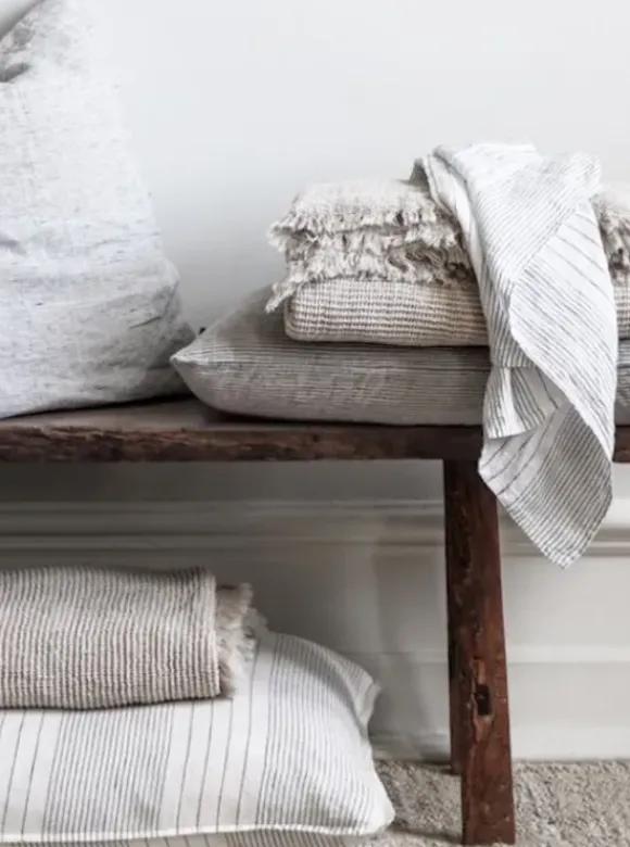 Tell Me Moren ihanat pellavatyynynpäälliset nyt Cafelattessa! Tässä tyynyssä kaunis pikkuraita musta-valkoisena. Tuote kuvassa penkin päällä.
