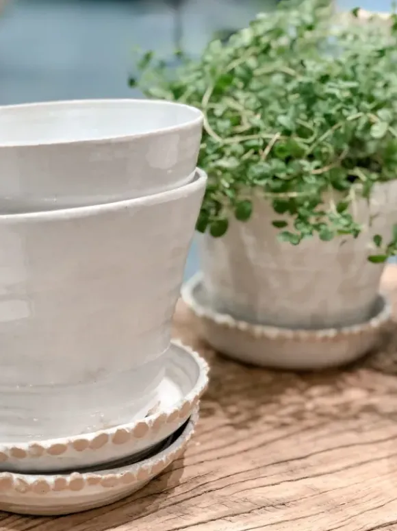 Kotimaisen Tuiasin keraaminen valkoinen kukkaruukku, jonka aluslautasessa yksityiskohtana kaunis koristekuvio. Ruukussa reikä pohjassa.