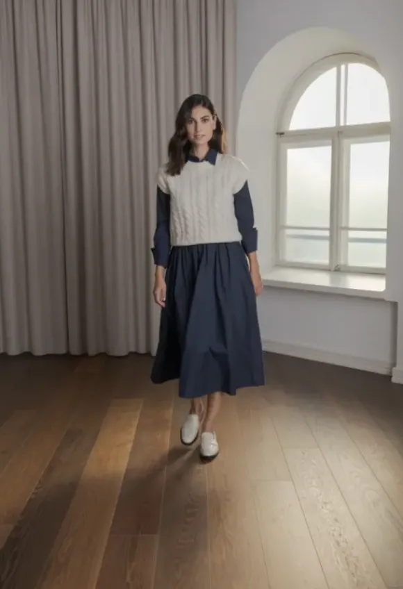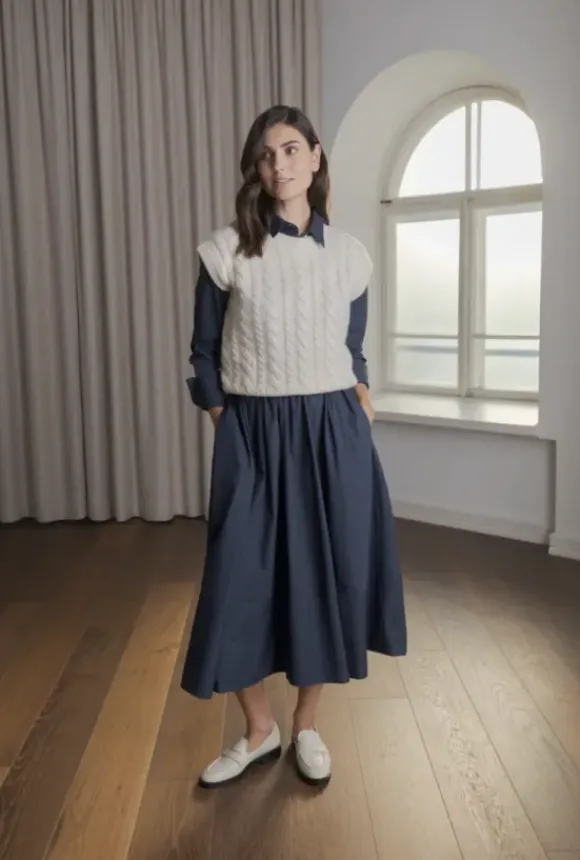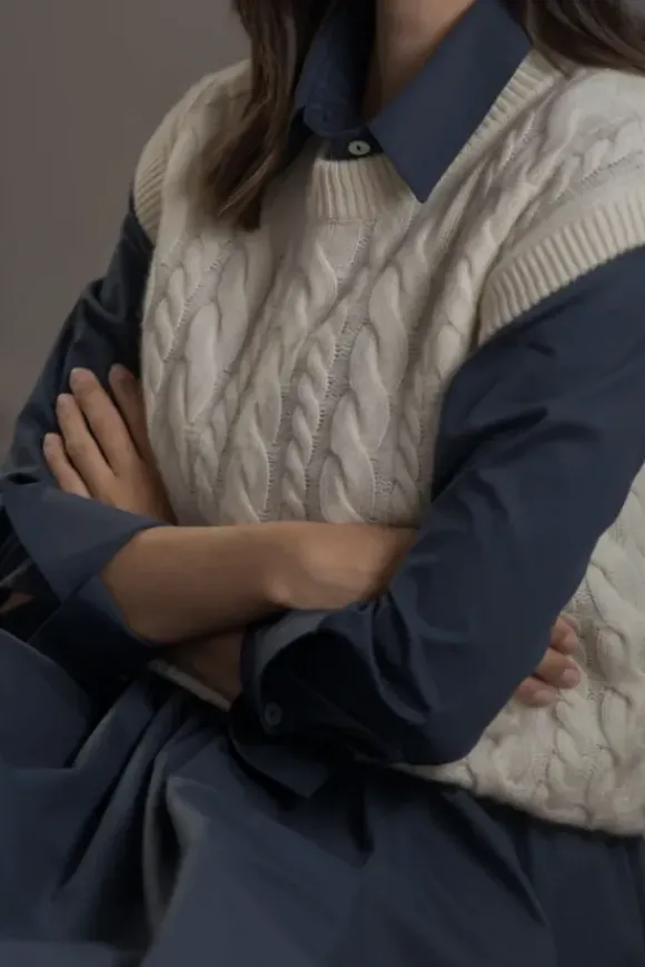 Laadukas villa-cashmeresekoitteinen neuleliivi, jossa on kaunis palmikkokuviointi ja olkapään yli ulottuva hihalinja. Toimii sekä toppina että kerrostettuna kauluspaidan kanssa.