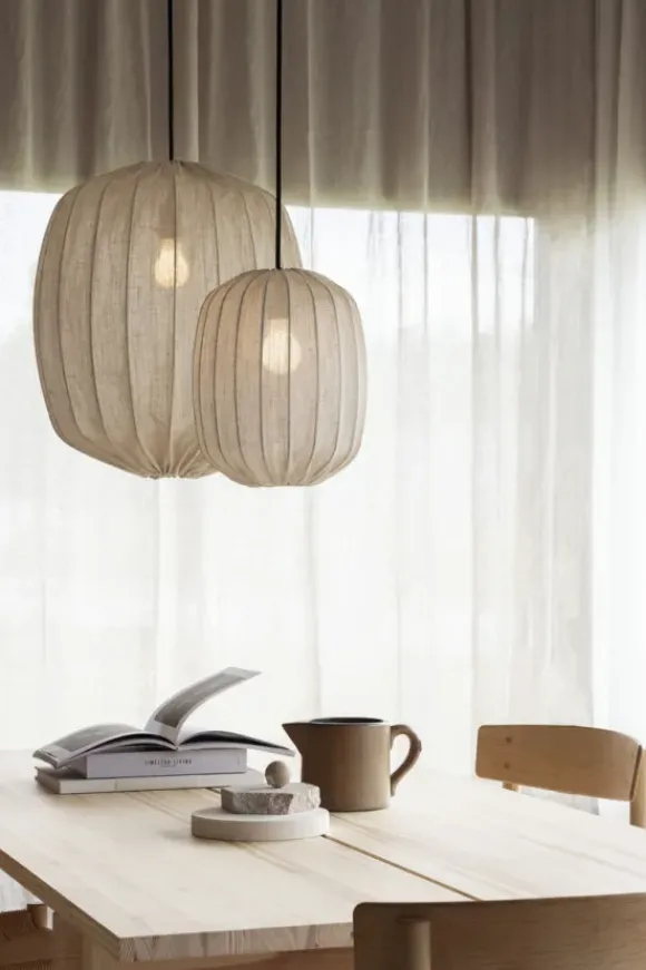 Kaunis kattovalaisin, jossa metallikehikko ja pellavakangas. Kankaan sävynä nature. Valo hohtaa kauniisti pellavakankaan läpi luoden eläväisen ilmeen. Prisma 45 sopii täydellisesti suuren keittiönpöydän yläpuolelle, olohuoneen pöydän päälle tai ryhmäksi sarjan muiden valaisimien kanssa.